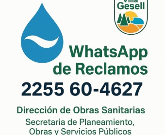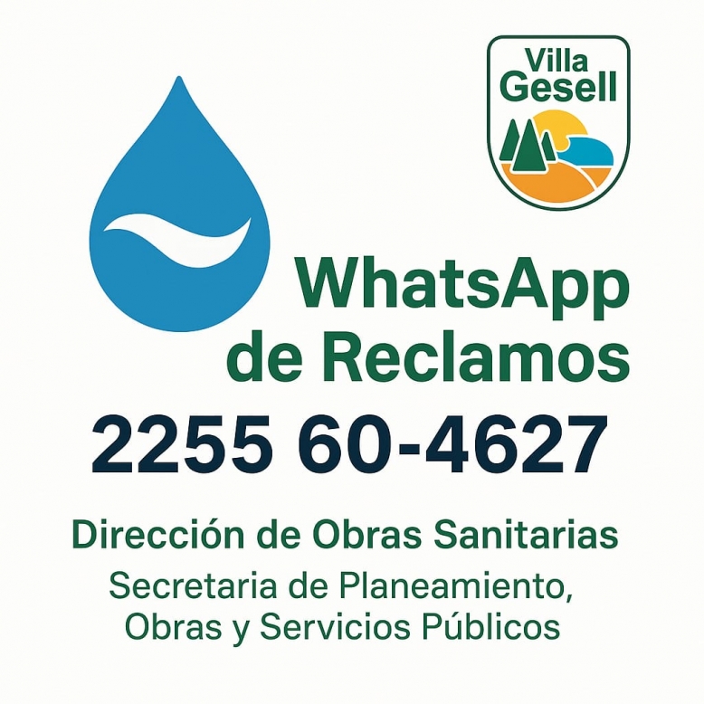 La Dirección de Obras Sanitarias informa que ya está habilitado el número de WhatsApp para consultas y reclamos sobre el servicio municipal de agua potable: 2255 60-4627. También continúa disponible el teléfono de guardia 24 hs: 46-2035.