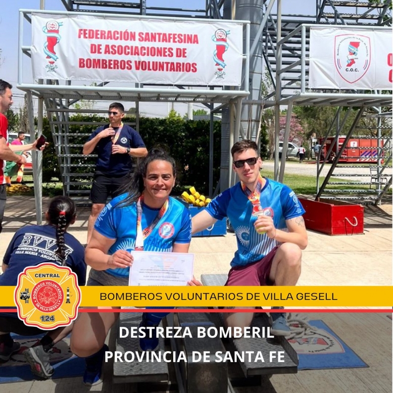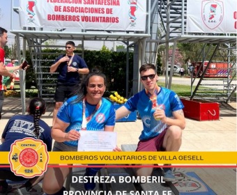 La Ayudante Mayor Melina Moncayo y el Ayudante Valentino Iriart representaron con orgullo a la institución geselina y a la Federación de Asociaciones de Bomberos Voluntarios de la Provincia de Buenos Aires (F.A.B.V.P.B.A) en las Olimpíadas de Destrezas Bomberiles organizadas por la Federación Santafesina, que se llevaron a cabo el pasado fin de semana en la ciudad de Gálvez, provincia de Santa Fe.