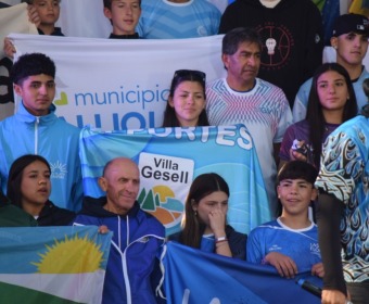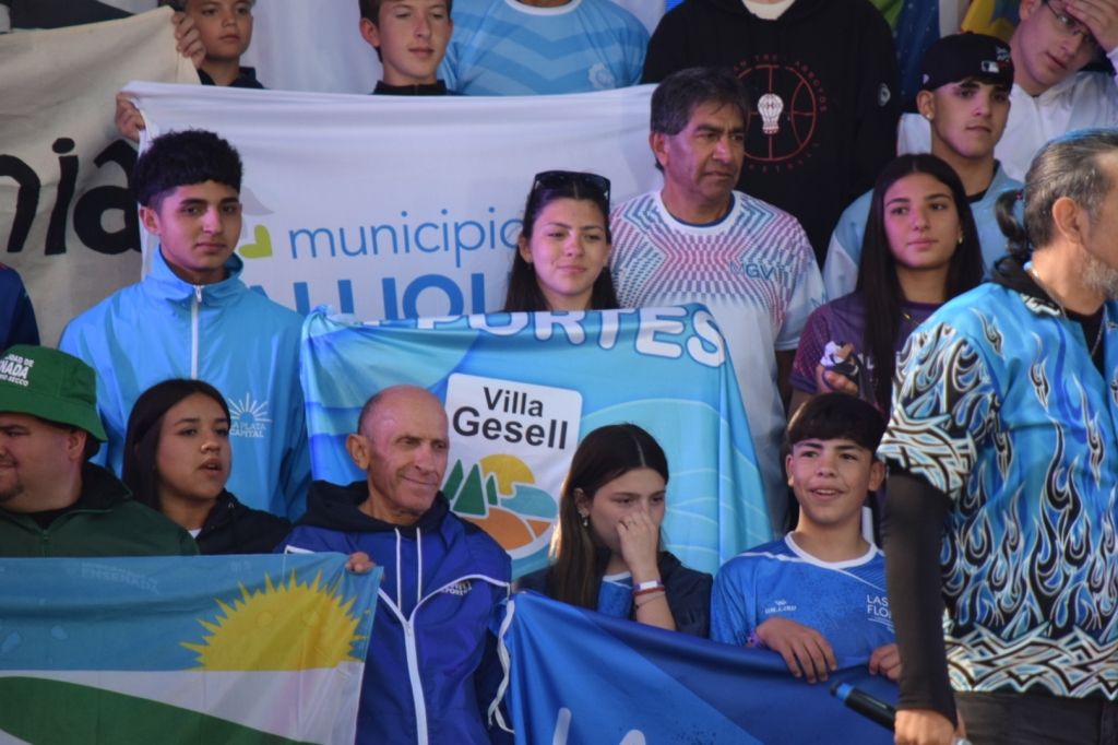 La delegación geselina participó del evento inaugural junto al intendente Gustavo Barrera. Durante la ceremonia, la atleta Sofía Mastrandrea, campeona en ediciones anteriores y actual competidora en lanzamiento de disco, subió al escenario como representante de Villa Gesell.