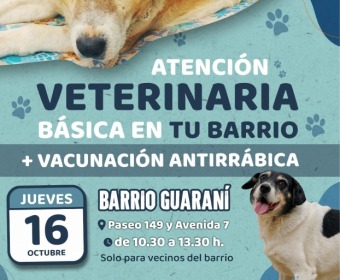 Este jueves 16 de octubre, se llevará a cabo una jornada de atención veterinaria básica y vacunación antirrábica destinada a los vecinos del barrio Guaraní, de 10:30 a 13:30 h, en Paseo 149 y Avenida 7.