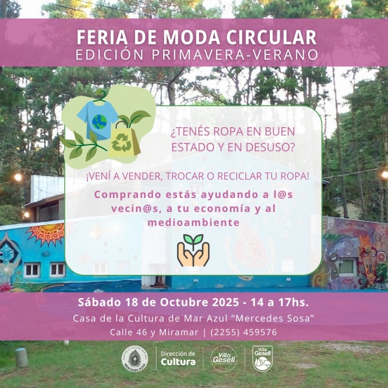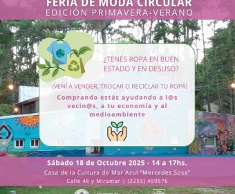 Invitamos a la comunidad a participar este sábado la "Feria de Moda Circular". Si tenés ropa en buen estado y en desuso la podés vender, trocar o reparar. Si necesitás comprar, elegí la moda circular, con tu compra ayudás a los vecinos, a tu economía y al medio ambiente.