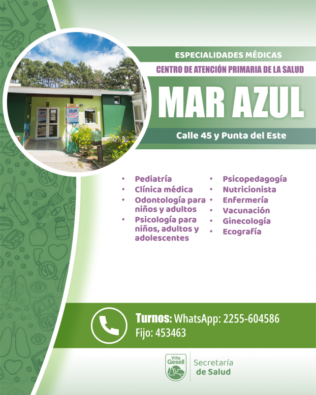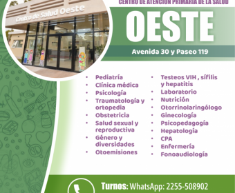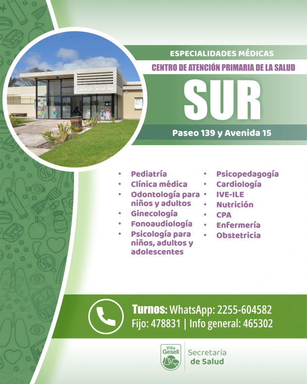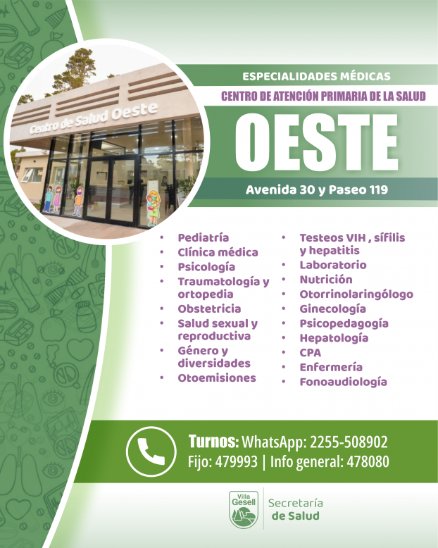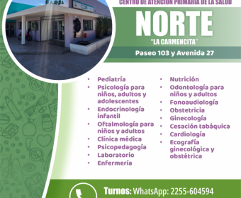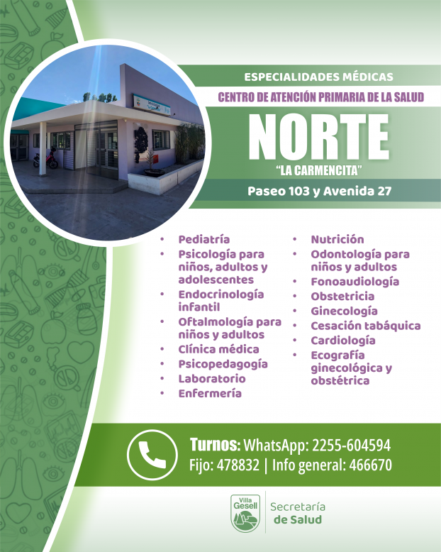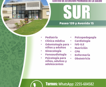La Dirección de Atención Primaria de la Salud continúa fortaleciendo los servicios y la calidad de atención en los distintos Centros de Atención Primaria del Partido. En este marco, se informa a la comunidad las especialidades disponibles en cada espacio, donde se pueden solicitar turnos de manera telefónica, por WhatsApp o de forma presencial.