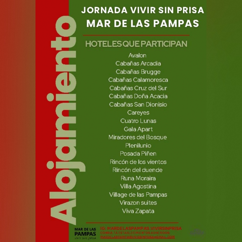 Entre los alojamientos participantes se encuentran: Doña Acacia, Cruz del Sur, Posada Piñén, Calamoresca, Gala Apart, Plenilunio, Rincón de los Vientos, Brugge, Rincón del Duende, San Dionisio, Viva Zapata, Miradores del Bosque, Careyes Villa de Mar, Virazón Suites, Village de las Pampas, Runa Moraira y Avalon.