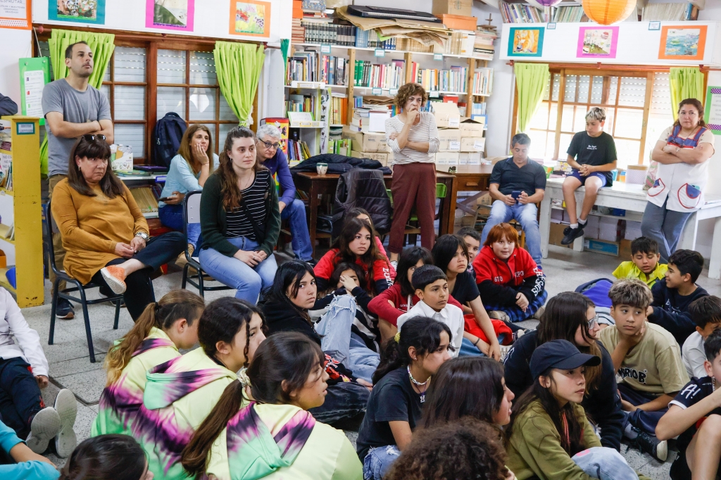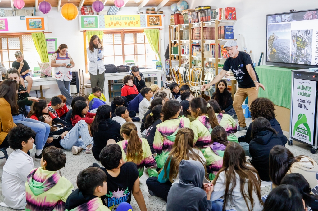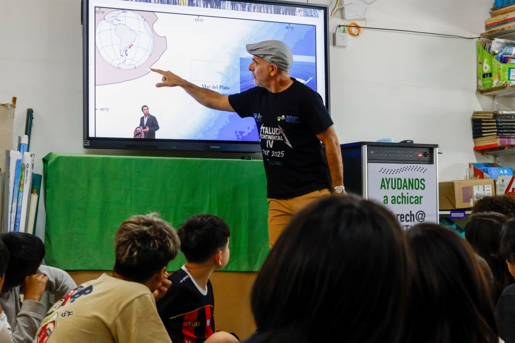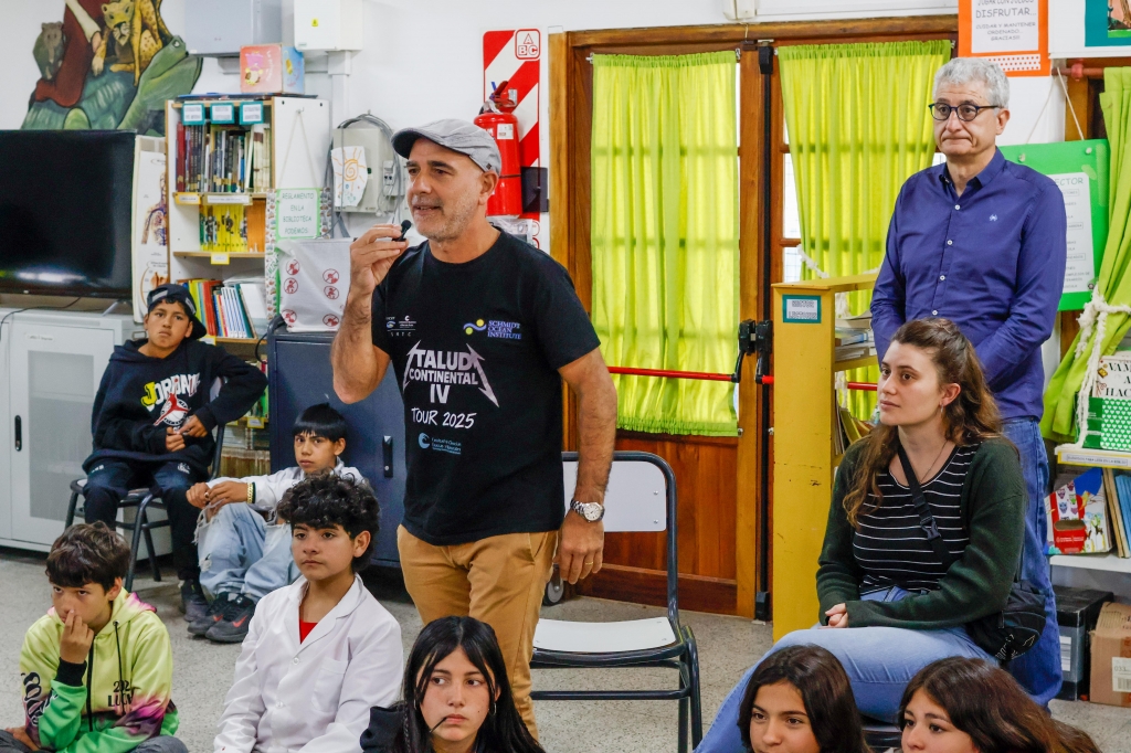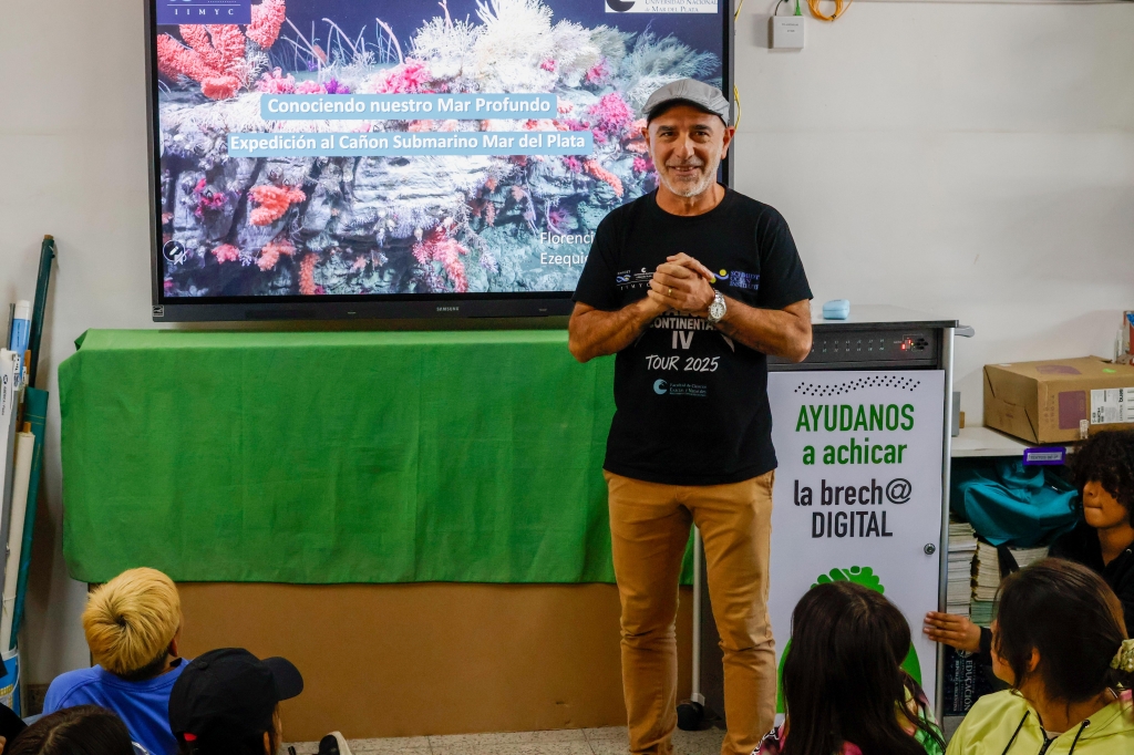 Con la participación de estudiantes de los tres sextos años, sus docentes y autoridades educativas, el Dr. Ezequiel Mabraña y la Lic. Florencia Matusevich ofrecieron una charla sobre la expedición científica que realizaron en julio frente a las costas de Mar del Plata, transmitida en vivo para todo el mundo.