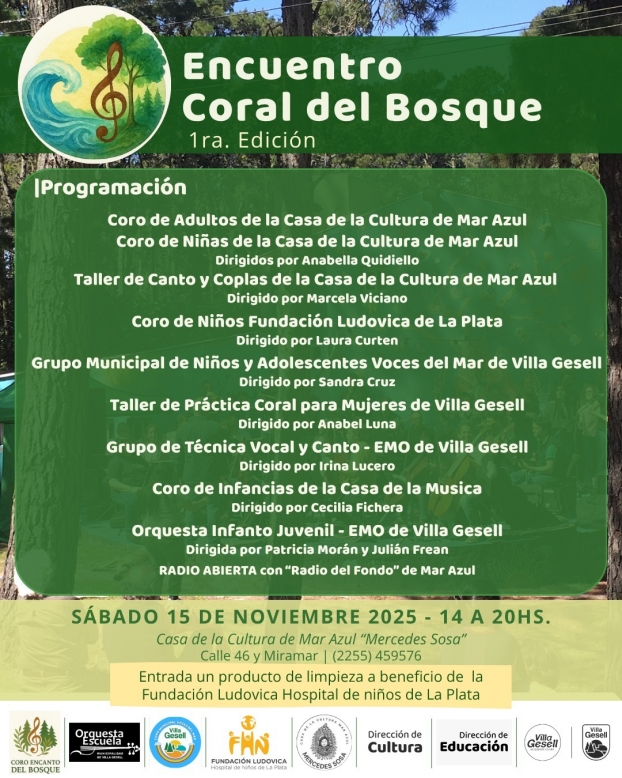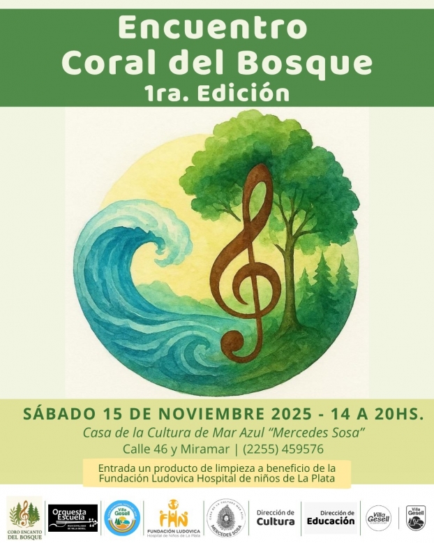 Se invita a la comunidad a participar del Primer Encuentro Coral del Bosque, una jornada llena de voces, música y arte, que se desarrollará el sábado 15 de noviembre, de 14:00 a 20:00 h, en la Casa de la Cultura de Mar Azul, ubicada en calle 46 y Miramar.