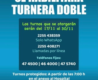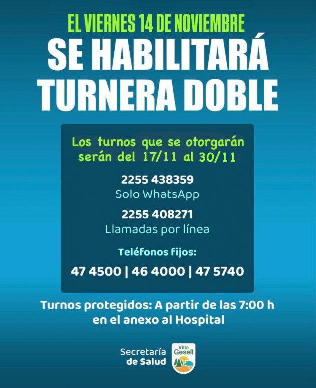 Con motivo del fin de semana largo que se extenderá del viernes 21 al lunes 24, la Secretaría de Salud informa a la comunidad que a partir de mañana se habilitará la turnera doble, otorgando turnos correspondientes al período del 17 al 30 de noviembre. La apertura de la próxima turnera será el 28 de noviembre.