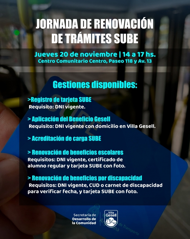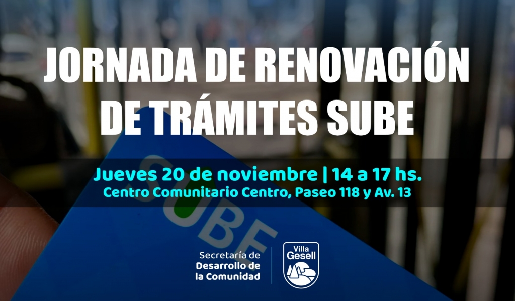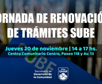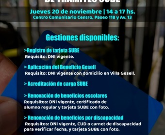 La Secretaría de Desarrollo de la Comunidad llevará adelante una jornada abierta para que vecinas y vecinos puedan gestionar trámites vinculados a la SUBE. Será el jueves 20 de noviembre, de 14:00 a 17:00 h, en el Centro Comunitario Centro (Paseo 118 y Avenida 13).