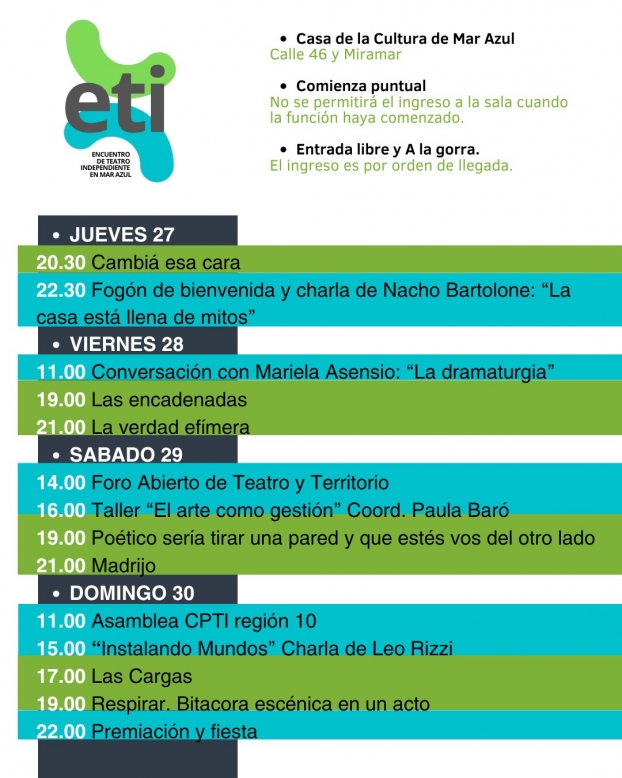 20:00 hs – Cambiá esa cara. Dramaturgia y dirección: Natalia Kramer. Actúan: Alita Nuñez, Mariana Cammi, Cecilia Leonardi, Candela Franiuk, Axel Otarola, Mariano Rodríguez. (Mar del Plata).