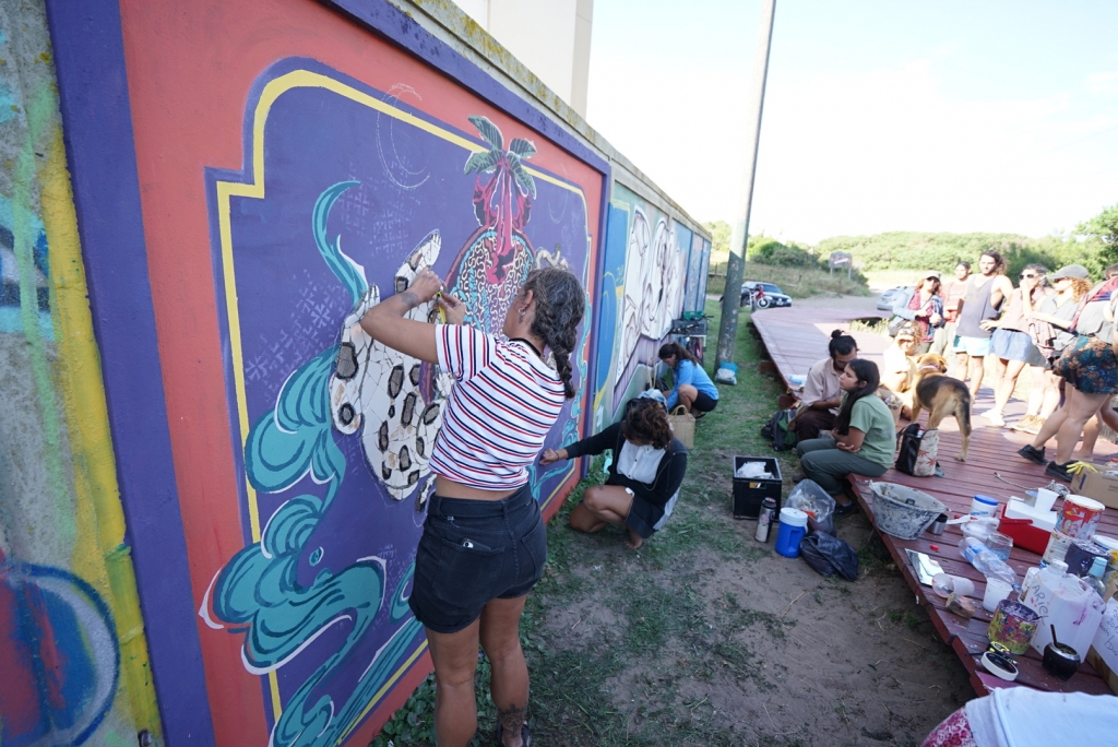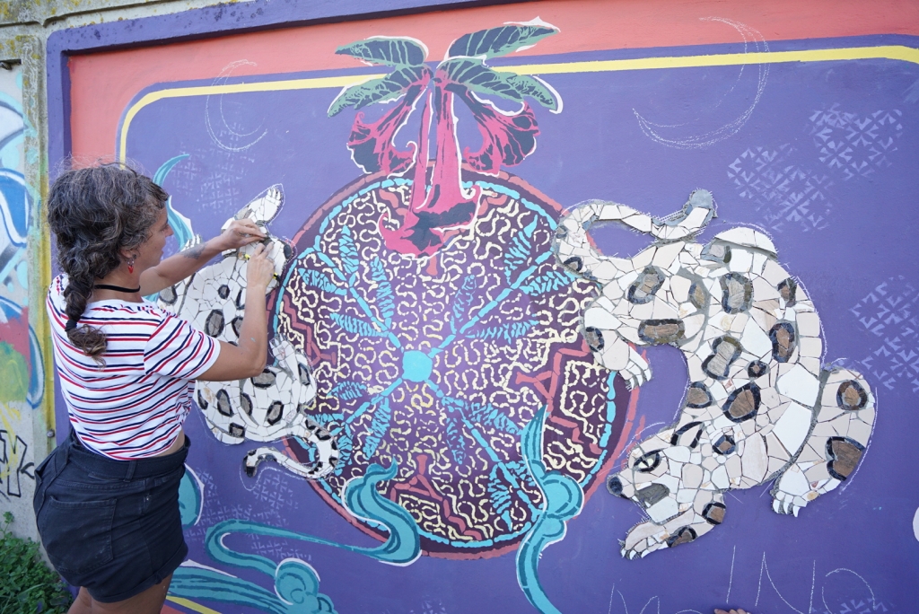 El trabajo se desarrolló en distintas etapas y combinó varias técnicas: mosaico, stencil y pintura, logrando una pieza final unificada y llena de texturas.