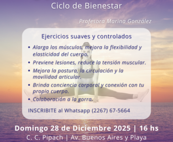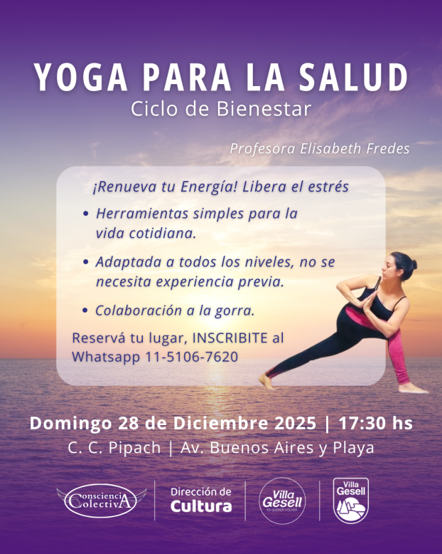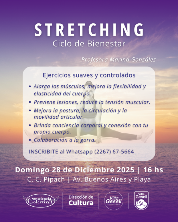 Ciclo de bienestar: a las 16:00 h, clase de stretching, y a las 17:30 h, yoga para la salud. Centro Cultural Pipach, Avenida Buenos Aires y Playa, a la gorra.