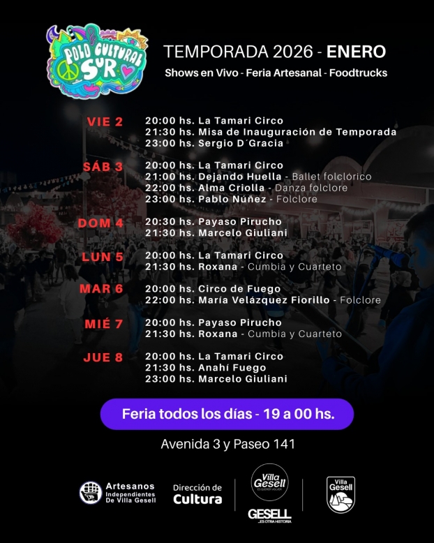 POLO CULTURAL SUR (Shows en vivo, feria artesanal y food trucks en Avenida 3 y Paseo 141). Todos los días de 19:00 a 24:00 h.