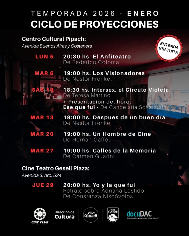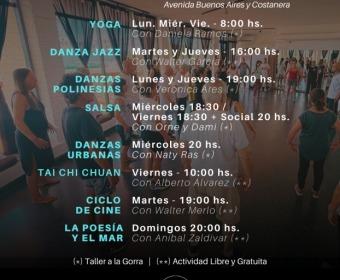 La Secretaría de Turismo, Cultura, Educación y Deportes da a conocer el cronograma de proyecciones y talleres para la temporada alta en el espacio cultural de Buenos Aires y Playa. Las proyecciones son con entrada gratuita, mientras que algunos talleres son a la gorra y otros sin costo alguno.
