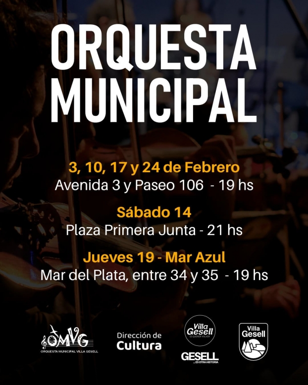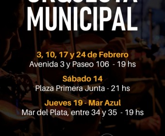Con más de 50 músicos en escena y bajo la coordinación del maestro Marcelo Devries, la Orquesta se presentará los días 10, 17 y 24 de febrero, en Avenida 3 y Paseo 106, a las 19 h, y el sábado 14 en el escenario de la Plaza Primera Junta, ubicada en Avenida 3 y Paseo 104, a las 21 h. Además, el jueves 19 el espectáculo se realizará en Mar Azul, en Mar del Plata entre 34 y 35, a las 19 h.