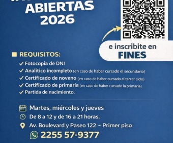 Las inscripciones al Plan FINES 2026 ya se encuentran abiertas para quienes deseen finalizar sus estudios primarios o secundarios. Las personas interesadas podrán inscribirse en la sede central ubicada en Boulevard y Paseo 112 (primer piso), los martes, miércoles y jueves, en el horario de 8 a 12 h y de 16 a 21 h.