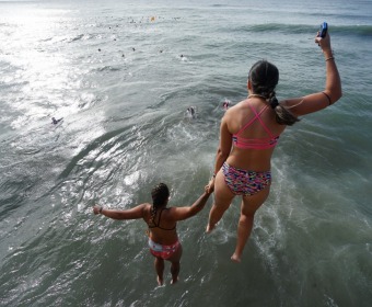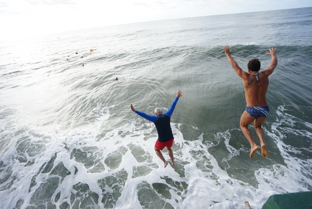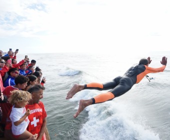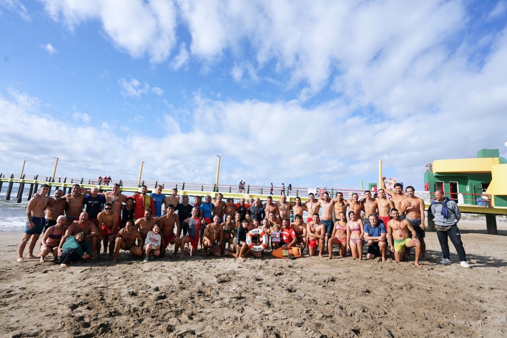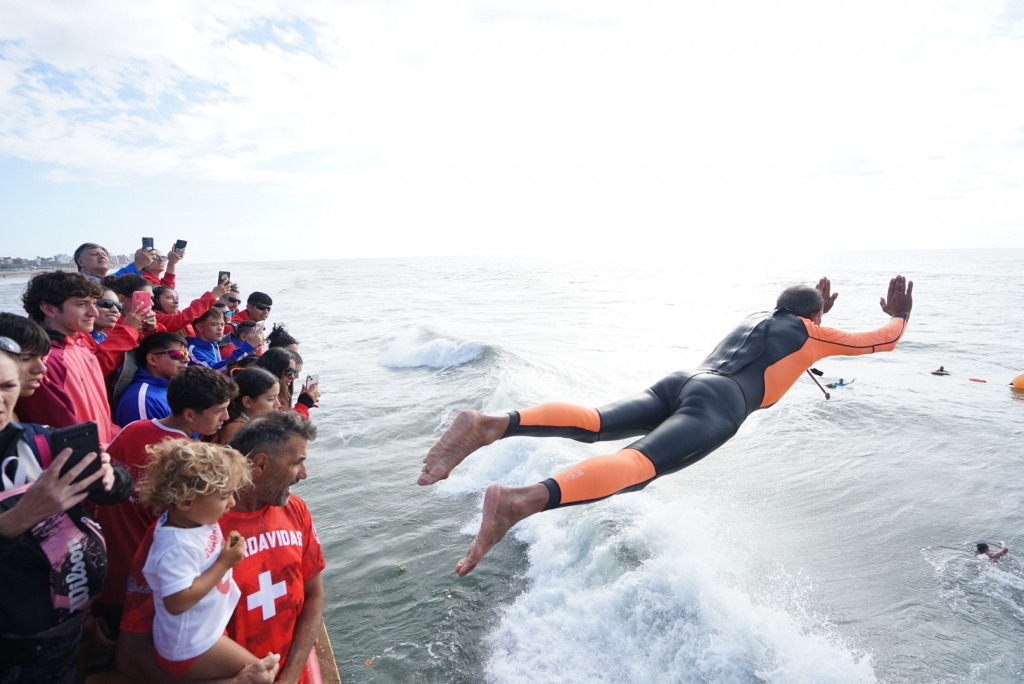 Hacia el cierre, los y las guardavidas culminaron la jornada con el tradicional salto al mar desde el Muelle, gesto que simboliza el compromiso y la vocación de servicio que desempeñan cada temporada.