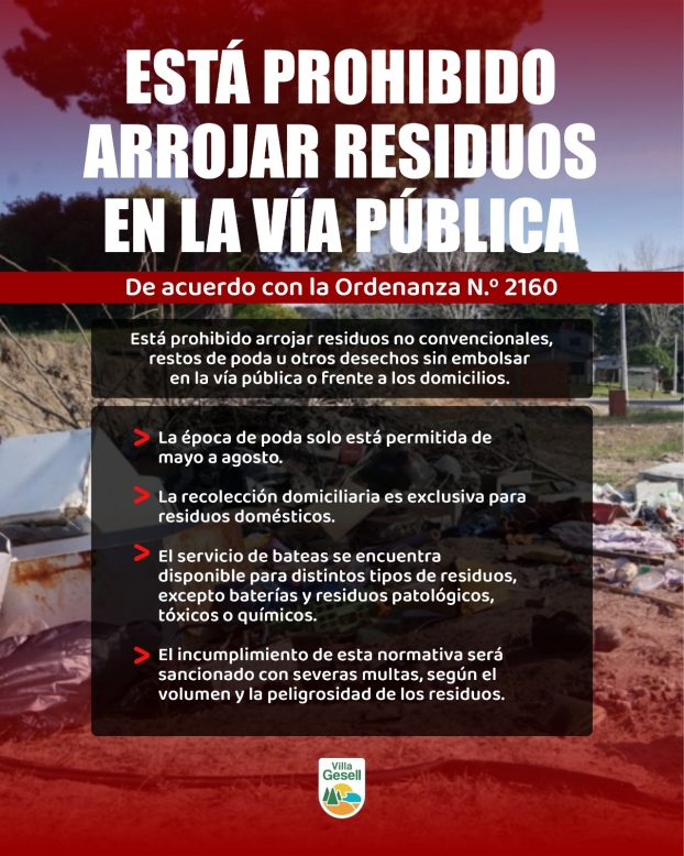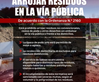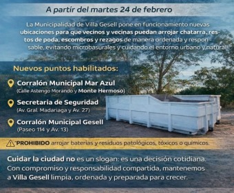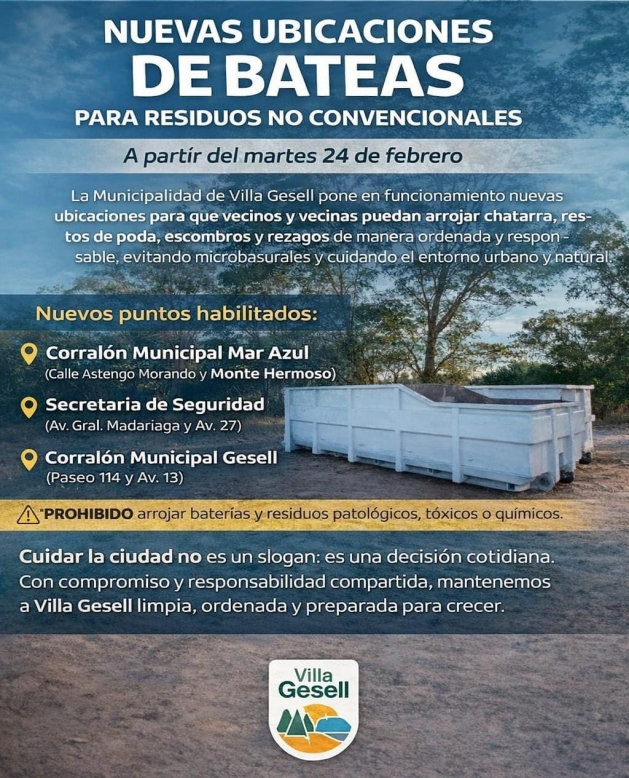 Desde la Secretaría de Obras y Servicios Públicos se recuerda que, a partir de hoy martes 24, se pone en funcionamiento una redistribución de las bateas destinadas a residuos no convencionales. En estos contenedores se podrán depositar restos de poda, chatarra y escombros, con excepción de residuos patológicos, químicos, tóxicos y baterías.