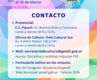 La Dirección de Cultura abre la convocatoria a talleristas para participar del año lectivo 2026. Se recibirán propuestas artísticas, educativas y de otras disciplinas hasta el 10 de marzo inclusive.