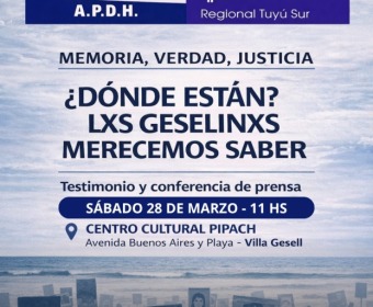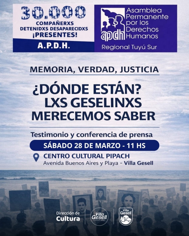 Bajo la consigna “¿Dónde están? Los geselinos merecemos saber”, la Asamblea Permanente por los Derechos Humanos (APDH) convoca a la comunidad a participar de un encuentro que incluirá un testimonio y una conferencia de prensa. La propuesta busca generar un espacio de reflexión y diálogo para seguir manteniendo viva la memoria colectiva.