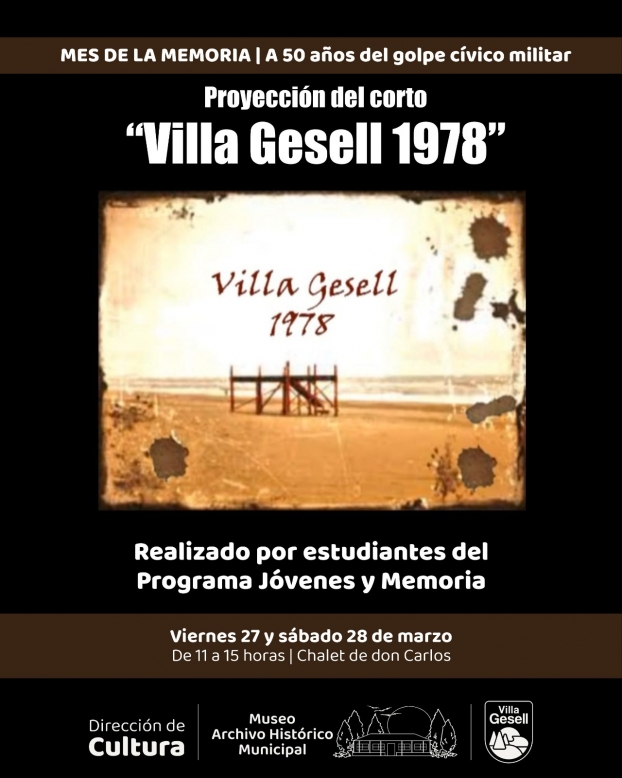 En el marco del mes de la memoria y a los 50 años del golpe cívico militar, se invita a la comunidad a la proyección del corto hoy viernes 27 y mañana sábado 28, de 11 a 15 h, en el Chalet de Don Carlos. La actividad es impulsada por el Museo y Archivo Histórico junto a la Comisión por la Memoria, por la Verdad y por la Justicia de Villa Gesell.