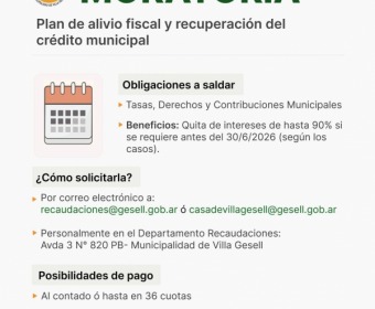 El Municipio de Villa Gesell continúa con el Plan de Alivio Fiscal y Recuperación del Crédito Municipal, establecido mediante la Ordenanza Nº 3608/26, con el objetivo de brindar facilidades a vecinos y contribuyentes para regularizar obligaciones pendientes.