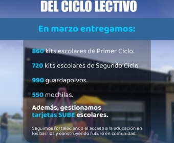 En total, se distribuyeron 860 kits escolares de primer ciclo, 720 de segundo ciclo, 990 guardapolvos y 550 mochilas. Además, se llevó adelante la gestión de tarjetas SUBE escolares.