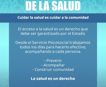 El acceso a la atención sanitaria es un derecho que debe ser garantizado por el Estado. En este sentido, desde el Servicio Psicosocial, dependiente de la Secretaría de Desarrollo de la Comunidad, se trabaja diariamente brindando contención y acompañamiento a la comunidad. El servicio funciona todos los días, de 8 a 14 horas, en el Hospital Municipal.